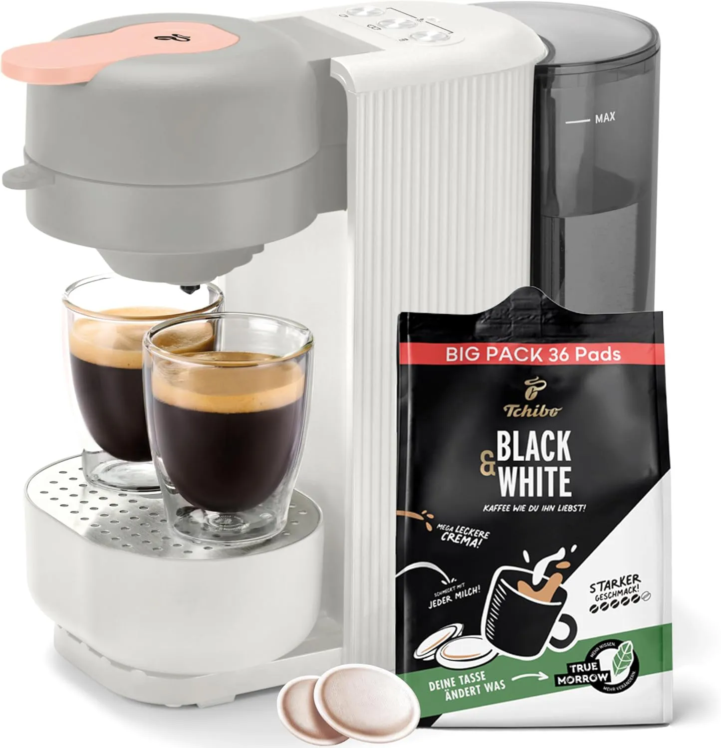 - 2 Tassen parallel: Mit einem passenden Behälter für 2 Pads kann man auch direkt zwei Tassen Kaffee gleichzeitig zubereiten. So muss keiner auf den anderen warten.